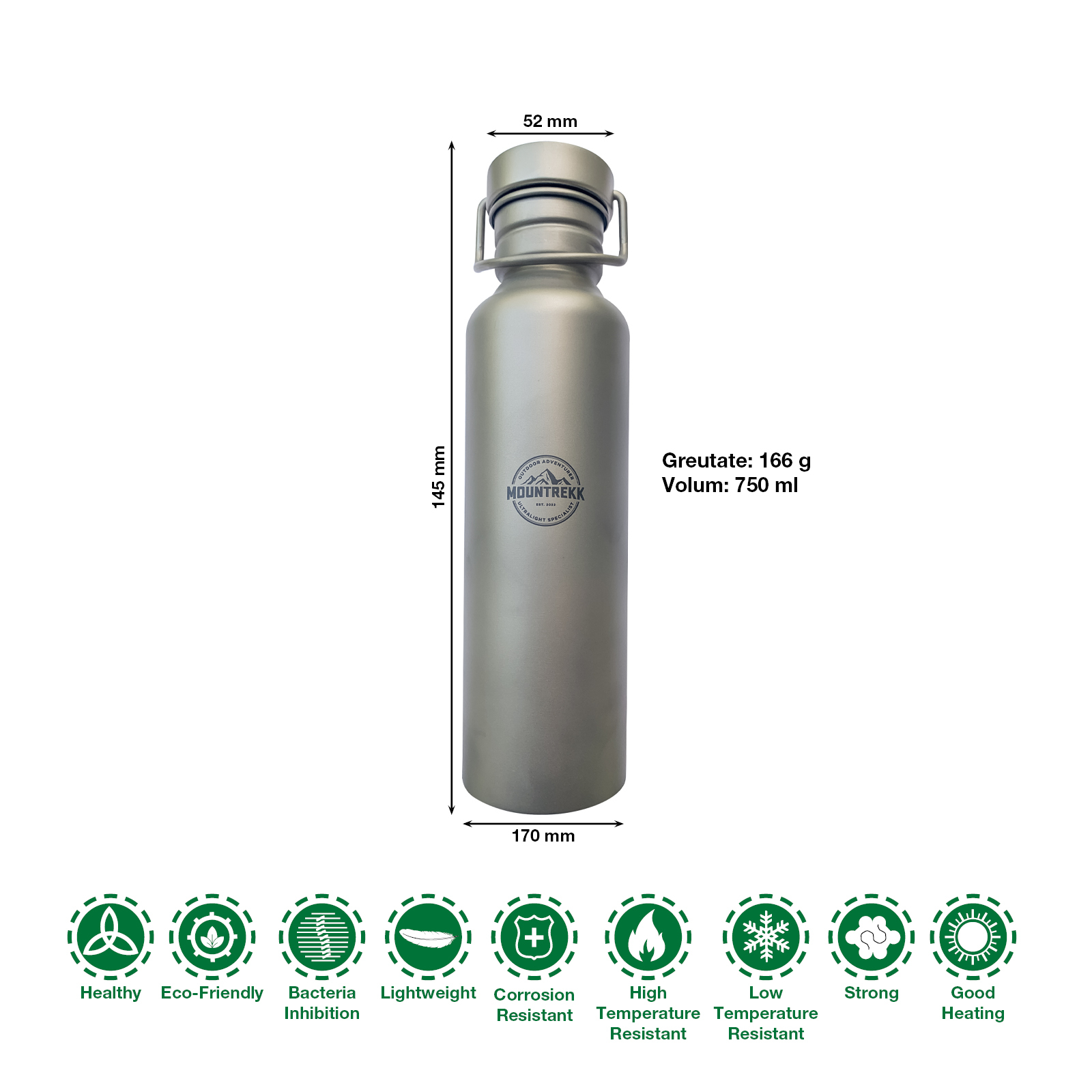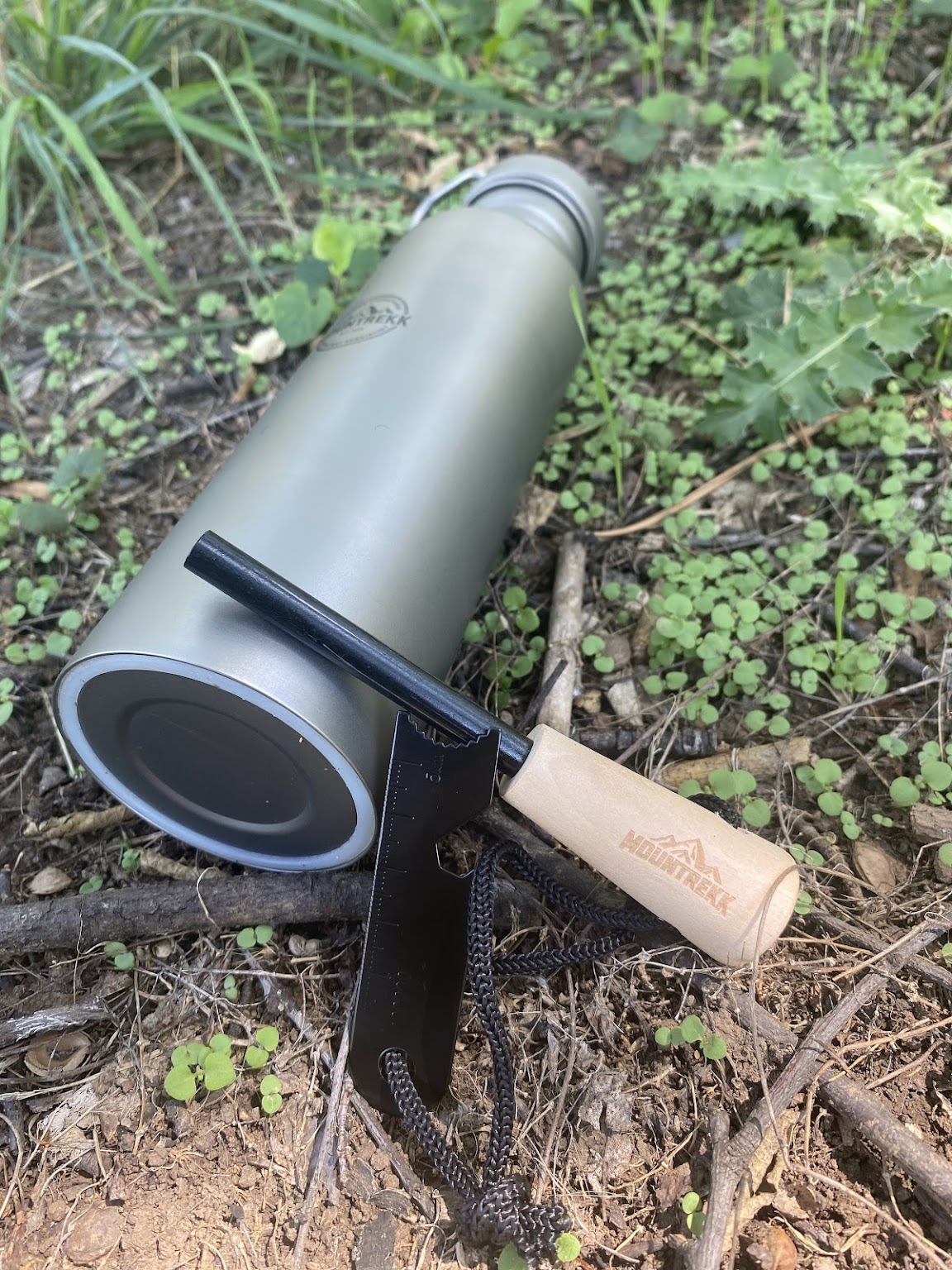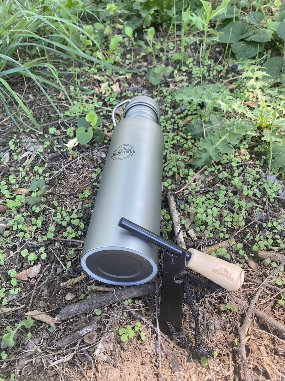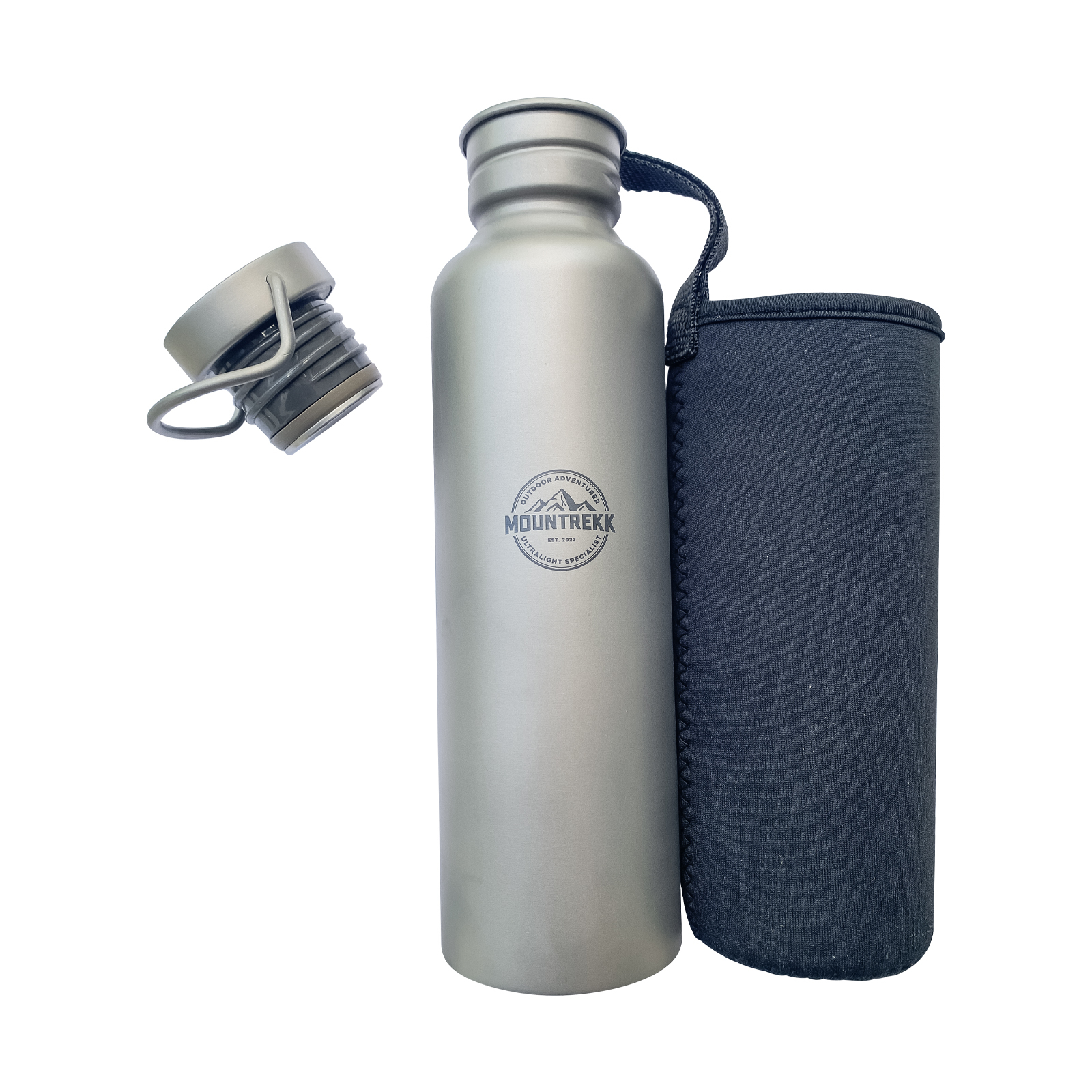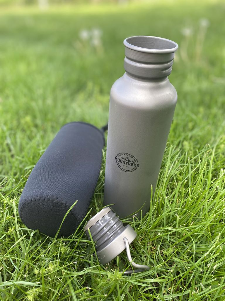 Bidonul din titan marca Mountrekk nu adauga greutate suplimentara rucsacului, cantarind doar 166gr.